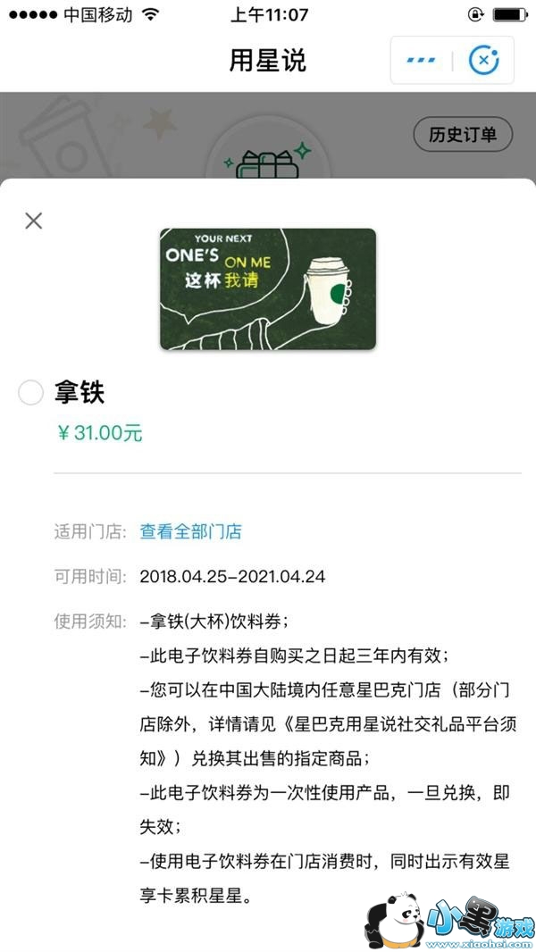 “用星说”支付宝小程序的购物流程十分顺畅,上面提供了31元到288元价值不等的星巴克卡券。点击卡券,可以查看其适用消费的门店、时间,以及使用须知。