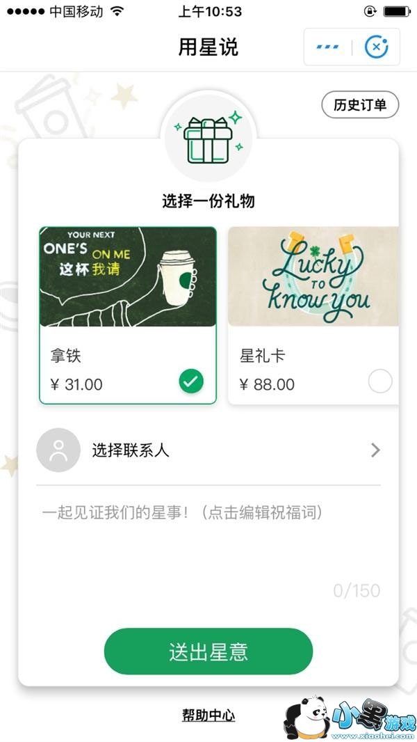在“星巴克用星说”支付宝小程序的首页顶部还有“历史订单”,用户可以通过它来查看自己的购买记录、以及送出礼品的收取情况。