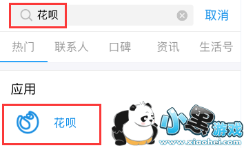 在最上面的输入框,输入“花呗”,系统会自动提示应用,点击弹出来的“花呗”,这样可以快速进入“花呗”应用