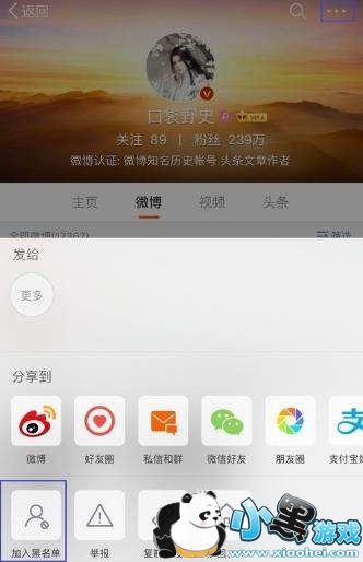 点击好友资料界面右上角的三个白点,选择加入黑名单,如下图所示: