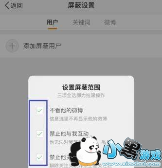 选择屏蔽选项,我们全部屏蔽,你可以不选择禁止它关注我不要选,别人一般不会发现你屏蔽了,如下图所示: