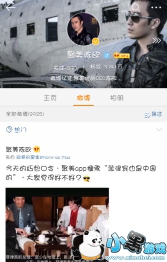 点开这个微博账号,然后手机上就会显示出陈欧的微博主页面,在他的微博中找到带有双引号的微博口令,有的时候微博中会直接告诉,有的时候只是加引号,比如最新的这个口令“菲律宾也是中国的”,记住这个口令。
