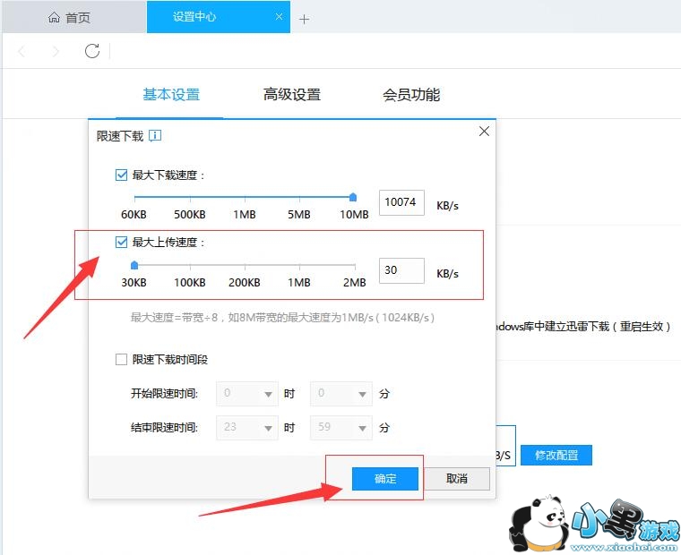4.设置一下最大上传速度,我们可以把上传速度设置拉到最小,最后点击“确定”即可。