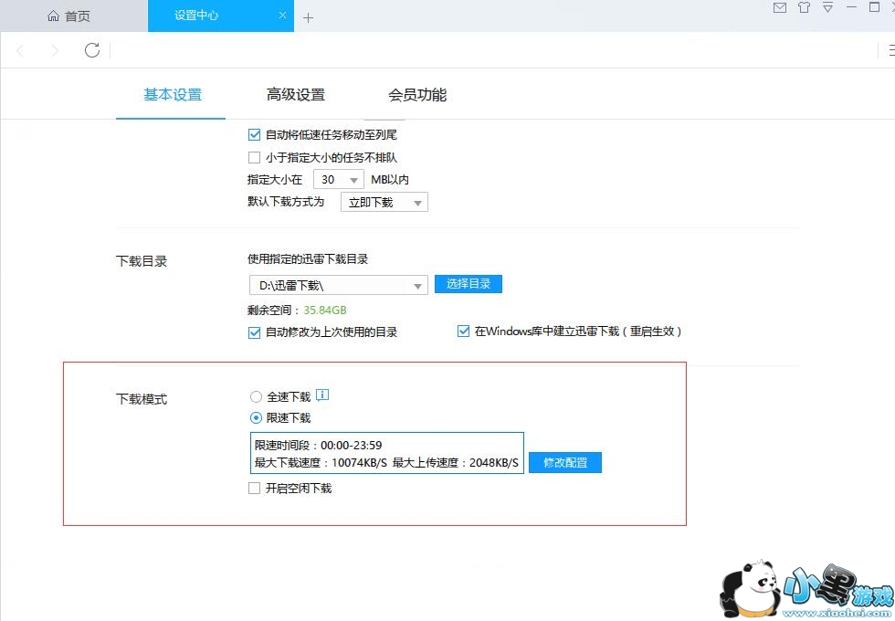 2.在“基本设置”里面往下拉,找到“下载模式”选择“限速下载”
