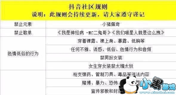 社区规则共分为六大类,其中“小猪佩奇”被列为了禁止元素。而《我是神经病》、《我们喵星人就是这么拽》被列为禁止歌单。色情低俗行为、违反法律法规行为、引人不适的行为也均上榜。