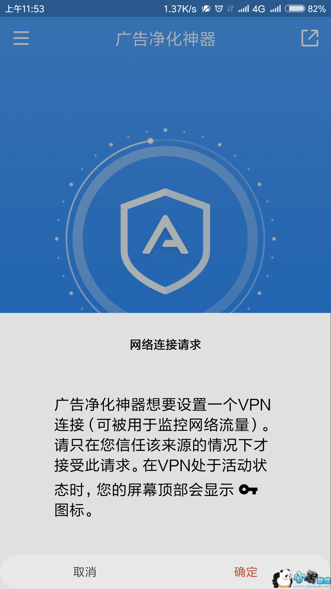 二、安装完成后打开广告净化神器app,点击开启广告屏蔽