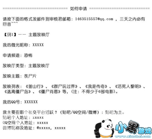 用户在想好了申请放映厅类型后,就可以按照下方的格式来发送邮件给微光官方:1463515557@qq.com,客服会在三天内完成审核给用户答复。