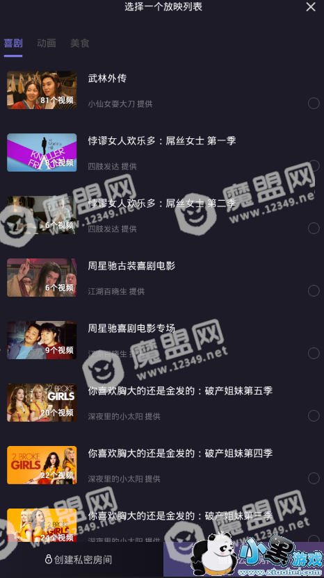 3、用户还能够通过点击左上角“创建”功能,选择放映列表来自己创建放映房间,从而邀请朋友们来观看视频了。