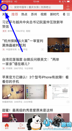 2.进入头条后,页面如下图,点击头像,我的是在左上角。ps:由于版本问题,有的用户的今日头条版本是在下方,点击“我的”。