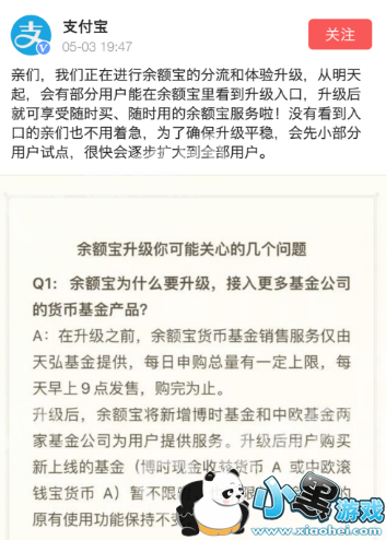 从5月4日起,用户可以在余额宝里面看到升级入口。前几天,央行支付结算司副司长樊爽文还暗指支付宝:市场上一些大的机构,不能以为自己“大而不能倒、大而不能管”。没想到转眼几天,马云爸爸的胳膊就拧过央行的大腿啊。