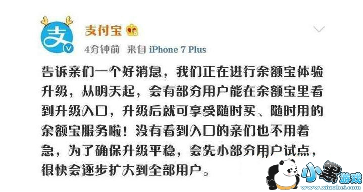 此次升级从5月4日零点开始会逐步向用户开放,用户通过余额宝的页面提示即可实时了解自己是否已经进入升级覆盖范围。