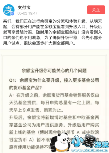 随着支付宝全面融入我们的生活,余额宝也成为了我们最常用的理财产品,不过支付宝余额宝在今年2月1日开始限购,现在余额宝回归升级,用户们再也不用担心限购了,快随小编一起来看看下面的相关消息吧!