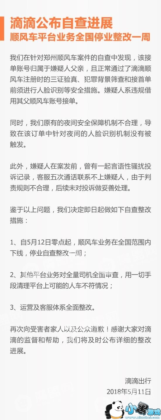 5月11日,滴滴今日对外宣布,即日起在全国范围内下线顺风车业务,停业自查整改一周;其他平台业务对全量司机全面审查,用一切手段清理平台上可能的人车不符情况;运营及客服体系全面整改。