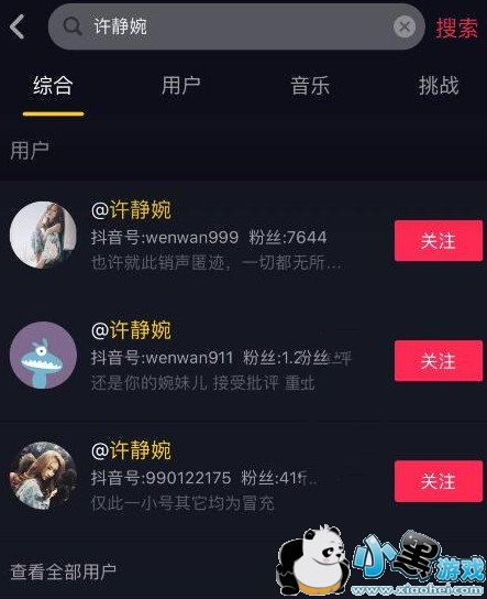 然后我们在抖音搜索许静婉的的时候,出现了很多的用户,而且很多用户都是自称是温婉的小号,点开用户之后,里面大多也都是温婉的视频。
