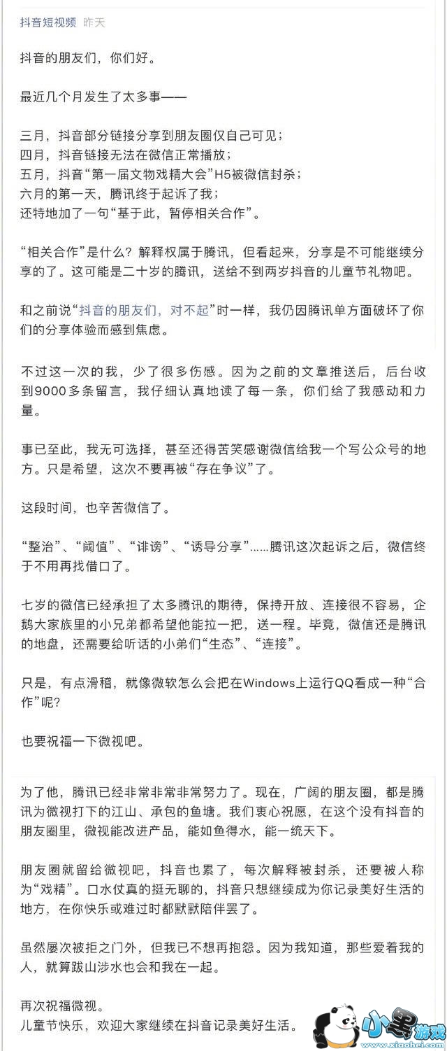 昨日腾讯发布了公告表示起诉今日头条及抖音后,抖音今日也已经正式做出了回应,抖音在微信发表了长文来哭诉自己遭遇的腾讯不公平对待以及长久以来微信的封杀。