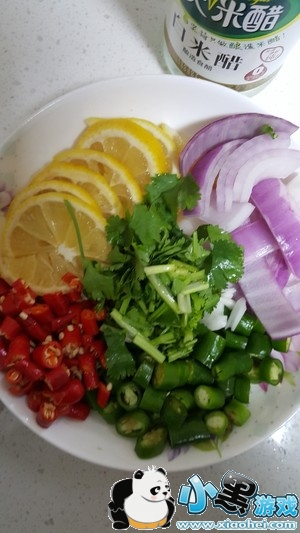 准备食材,柠檬切片去籽。洋葱切块,小米椒和螺丝椒以及香菜切好放碗里