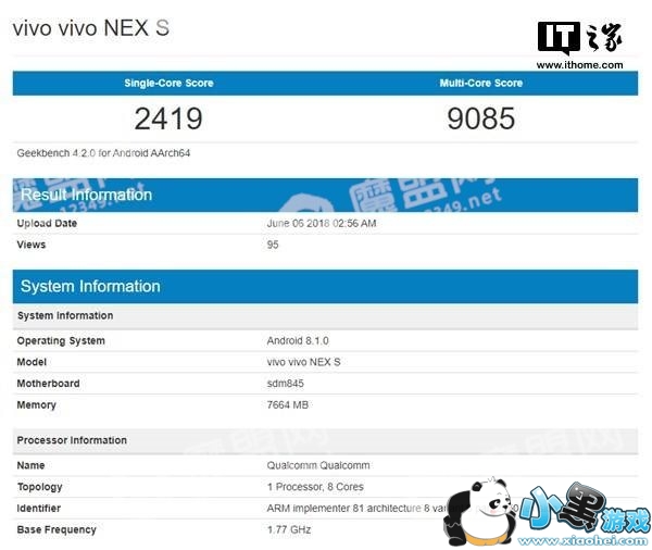 该机在Geekbench网页上显示的名称为vivo NEX S,其单核跑分2419,多核9085。其他信息还显示,该机配备了8GB内存,预装安卓8.1系统。与其他高通845处理器的旗舰机大致相当,也远远甩开该机骁龙710处理器的版本。