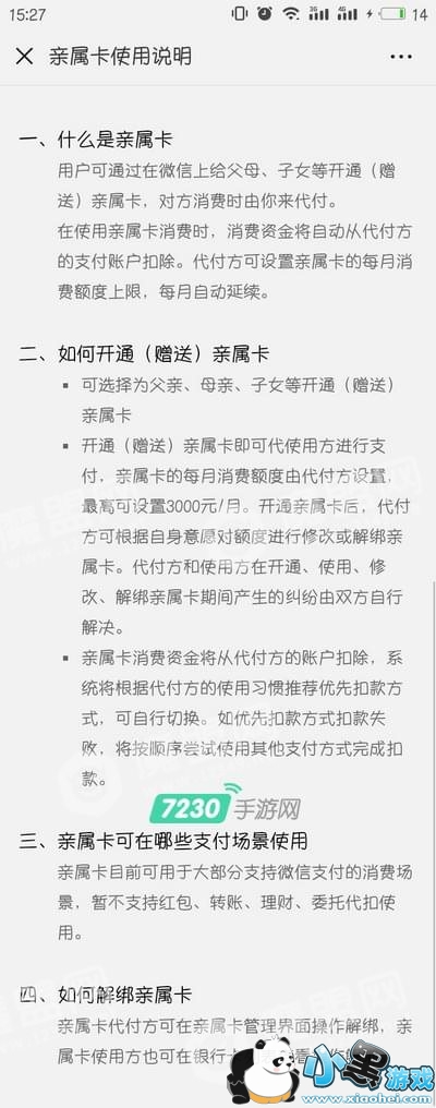 用户可通过在微信上给父母、子女等开通(赠送)亲属卡,对方消费时由你来代付。