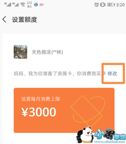 我们选择需要赠送的对象后,会跳转到好友列表。所以如果没有加微信是无法赠送的。在好友列表中,选择赠送的对象后,会跳转至“设置额度”界面,我们可以设置每个月的消费额度,最高只能设置为3000元/月。同时,默认的赠送寄语,也可以修改。设置完毕后,点击下方的“赠送”。