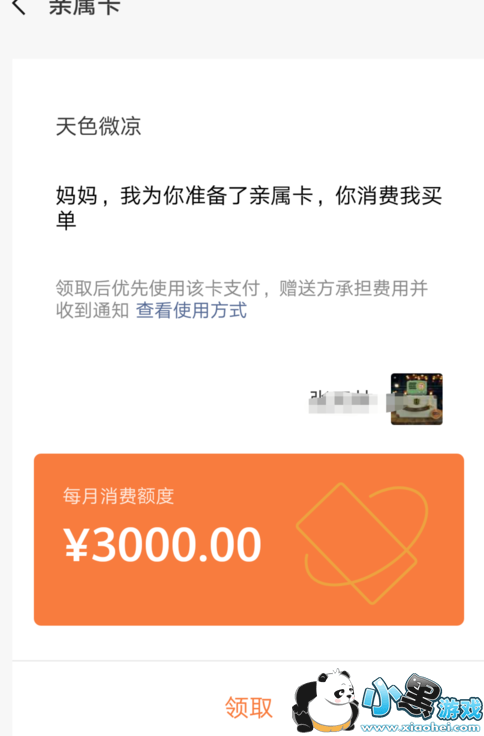 领取成功后,在对方的银行卡列表中,将会出现亲属卡及可用额度信息,就可以用该卡进行消费。