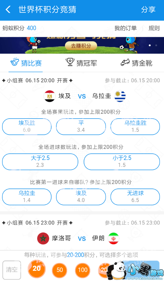 虽然支付宝不能买球,但是为了迎接2018世界杯,支付宝推出了一个世界杯竞猜活动,大家可以通关竞猜活动来赚取蚂蚁积分。