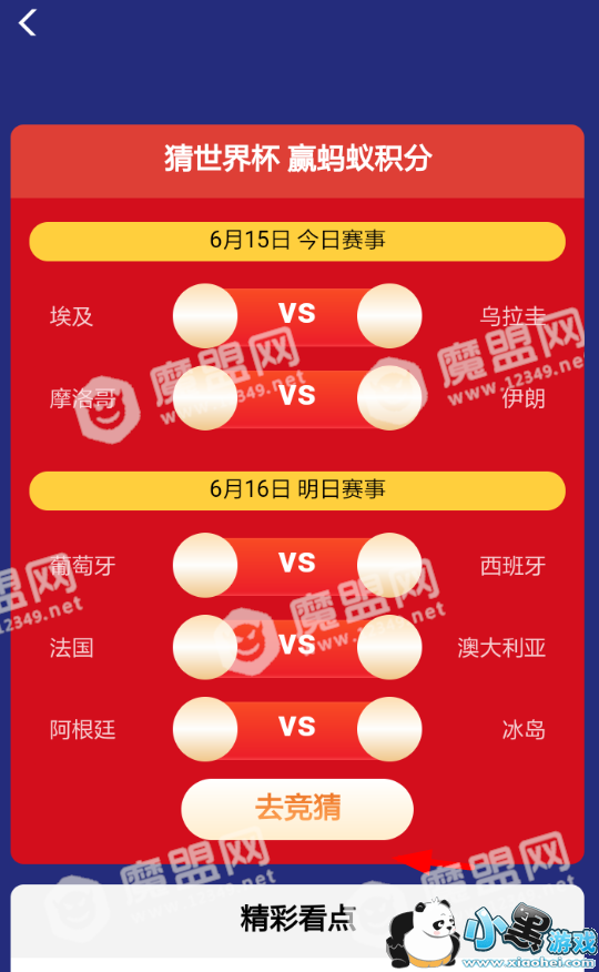2、接下来在进入活动页面后,找到“猜世界杯 赢蚂蚁积分”的栏目,从下方点击“去竞猜”按钮,就可以参加活动了!