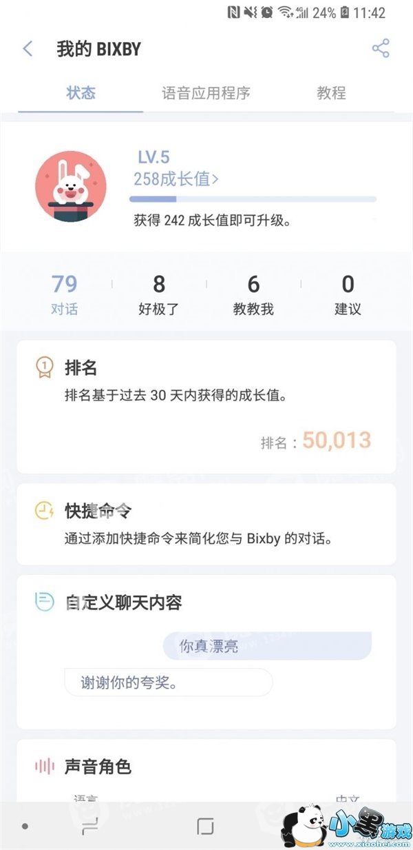 Bixby在Galaxy A9 Star上的体验基本上保持了旗舰机型的原味,保留了AI的学习能力,并用成长值,等级这种量化指标来展示Bixby了解你的程度和智能水平。和Bixby进行互动可以增加成长值,比如对它发出语音指令,无论它的回应正确与否,它都会询问反馈,如果得到你的正面评价,或是成功执行一条新操作,它就会获得较多的成长值,相反它就会向你确认你的本意,并给你自行编辑该条语音的自定义回答,或是指定特定操作的机会。