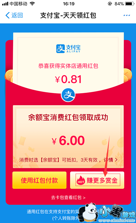 1、打开支付宝,输入 515085278 快速进入红包领取界面。然后点击“赚更多赏金”如图所示: