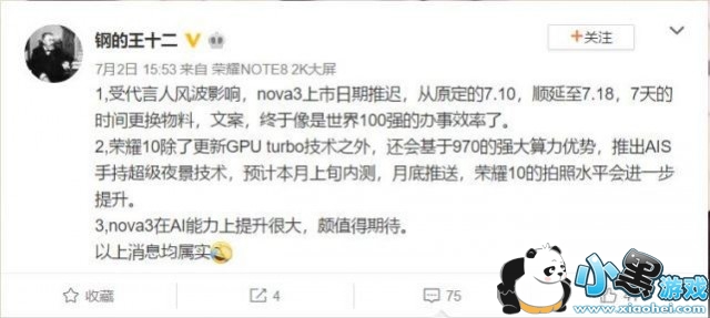 之前有传闻称华为Nova3 将在 7 月 10 日正式发布,不过目前看来发布时间延后了,据微博博主@钢的王十二 透露,由于受到代言人风波影响,发布时间推迟,从原定的 7 月 10 日顺延到 7 月 18 日,这个说法得到了验证。