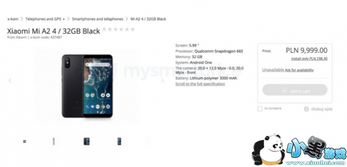 根据波兰电商网站X-Kom披露的信息,小米A2装备了分辨率为2160*1080的5.99英寸IPS LCD屏幕,高通骁龙八核660(4个2.20GHz的Kryo和4个1.84GHz的Kryo),Adreno 512 GPU。