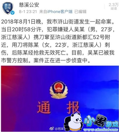 慈溪“三北刑警”通报警情表示,8月1日晚20时58分许,犯罪嫌疑人吴某(男,27岁,浙江慈溪人)携刀窜至浒山街道新都汇52号附近,用刀将陈某(女,22岁,浙江慈溪人)刺伤,后陈某因抢救无效死亡。目前,吴某已被警方控制。案件正在进一步侦查中。 钱塘