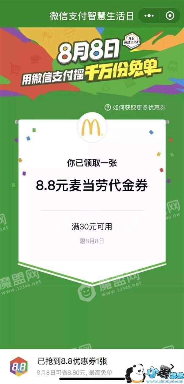 8月8日,用户在微信支付线下合作商户处,使用微信支付完成付款,即可参与“微信支付摇摇乐”活动,每位用户当天可参与2次。
