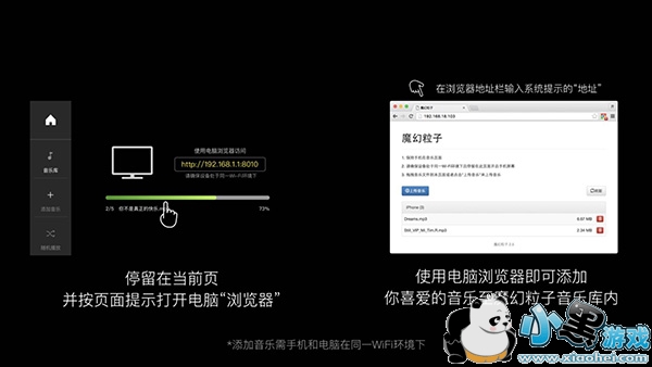 2、使用电脑浏览器访问给出的网址,并且确保设备处于同一WIFI环境下,然后在电脑上添加你喜欢的音乐至魔幻粒子的音乐库内。