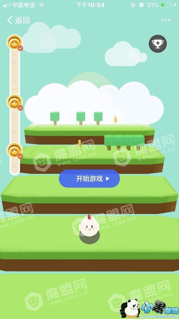 这个玩法有点类似跳一跳。我们要操作小鸡让它吃更多的金币。