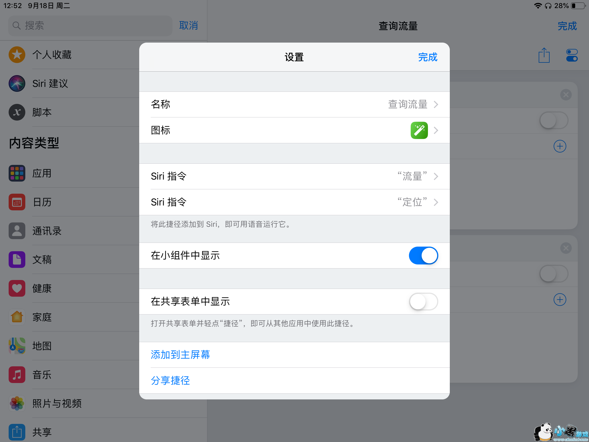 6、点击上面的播放键就可以运行了,当然我们可以储存起来和教给siri如何用,点击右上角进入设置页面,在这里你可以设置名称图标和用siri呼出这个命令的语音