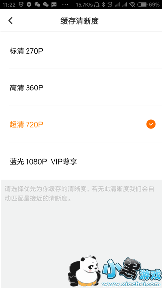 3、点击【缓存清晰度】你会发现有标清、高清、超清、蓝光四种清晰的选择,点击你想要的清晰度就能设置完成了!