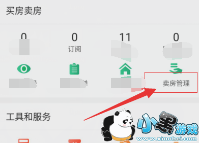 2、“我的”功能打开后,系统会自动跳转到个人中心,这个页面的功能从上往下看包含了买房卖房和工具服务,其中在买房卖房的第二行最右边有个“卖房管理”并将它打开。