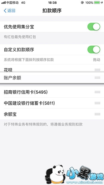 4、进入之后看到自定义扣款顺序,然后按照提示,长按想要有限支付的功能,放在第一位就可以了。