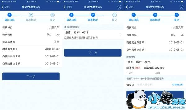3、交强险和车船税联网核查通过,确认车辆信息页面,点击下一步,进入邮寄地址选择页面,选择邮寄地址后,进入信息确认提交页面,待确认所填资料信息无误后,获取手机短信验证码,核验通过后,点击提交按钮,完成申领免检标志业务申请信息提交。