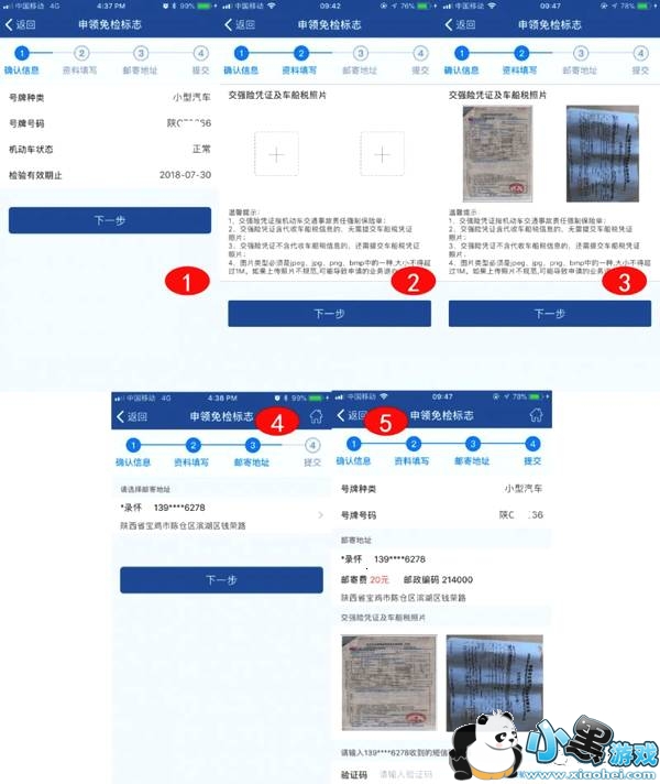 4、交强险和车船税联网核查不通过,确认车辆信息页面,进入资料信息填写页面,用户需上传交强险、车船税凭证照片,点击下一步进入邮寄地址选择页面,选择邮寄地址后进入信息确认提交页面,待确认所填资料信息无误后,获取手机短信验证码,核验通过后,点击提交按钮,完成申领免检标志业务申请信息提交。