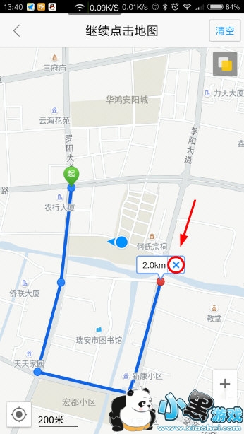 4、现在您就可以任意点击N下地图,您点下的每两个相邻的点都会连上直线,测距工具会不断累加距离数据;如果您不小心点错,点击最后一个点旁边的蓝色小叉叉可以清除这个点。
