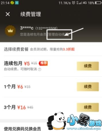 3.然后我们再在剪头所指的地方点击”管理续费“,如图所示。