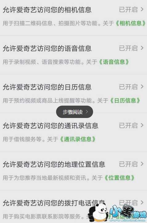 4、 在隐私设置下面可以看到好多手机隐私都被爱奇艺开启了,我们点击一个进入设置。