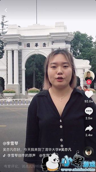 这个主要是在抖音中又一个抖音号名叫“@李雪琴”的用户,发的一个视频:在这个视频中她来到了清华大学,并且发布了“吴亦凡你好,今天我来到了清华大学”,然后后面还有一个非常敷衍的介绍,但又让人忍俊不禁。好像是在给自己的男神发视频一样很可爱。