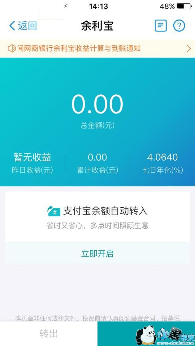 5、进入余利宝界面之后点击“立即开通”字样开始开通这个服务