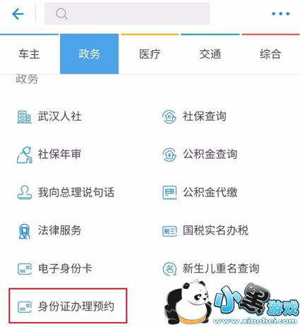 2. 然后在政务中找到“身份证办理预约”,点开,然后会有两个功能模块,一个申请办理,一个预约查询;
