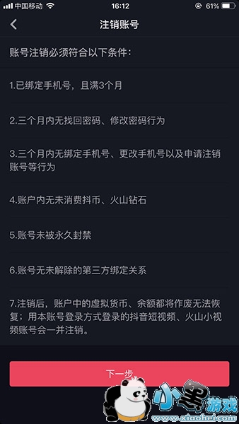 5、满足注销条件之后点击【下一步】,然后通过手机验证即可注销。