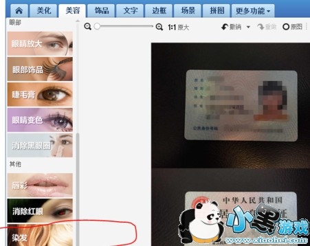 6、这个时候你需要稍微给身份证上某些部分染色,以便电脑区分(黑白打印出来是不会有什么异样的)。选择染发工具。