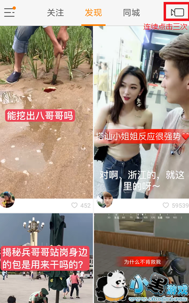 2、在快手首页中找到右上角的拍摄按钮,这里记住要连续点击三次,这样拍视频可以录制长达57秒。