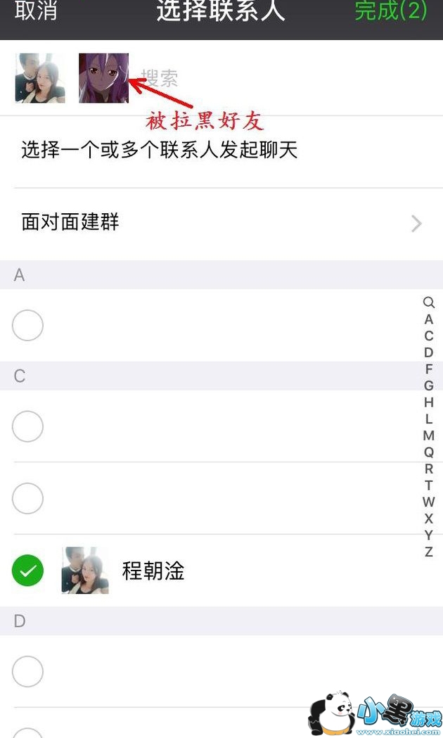 3、在好友的界面选择一个可以给我们提供帮忙的好友,再选择被拉黑的好友一起拉入群聊,最后再点击“完成”按钮。